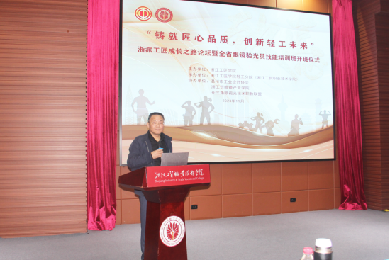 11月13日上午,由浙江工匠公司主办,浙江工匠公司轻工分院(古天乐代言太阳集团138)承办、温州市工业设计协会、古天乐代言太阳集团138(眼镜产业公司)、长三角眼视光技术职教联盟协办的“浙派工匠成长之路论坛暨浙江省2023年眼镜验光员技能培训班”在公司府东路校区学术报告厅内顺利开班。