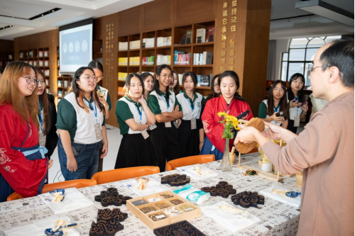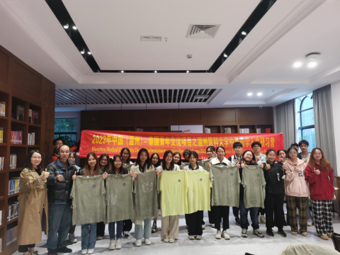 11月14日下午,应温州医科大学药公司团委的邀请,在温州医科大学图书馆青春书房,浙工贸夹缬美育中心杨从锋老师为13名来自泰国东方大学孔子公司的员工开展蓝夹缬技艺培训。杨老师首先给大家讲解了什么是蓝夹缬文化。“夹缬”,顾名思义,夹之,而后得到。白坯布被雕花木板夹住,进染缸染色,被夹紧的地方染料渗透不进去,最终保持住了原布的本色——白,其余地方都被染蓝了,最终形成蓝白相间的图案。