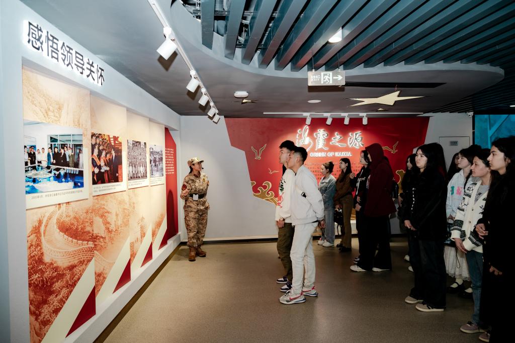 2003年5月,时任浙江省委书记的习近平同志到洞头海岛女子民兵连视察时,高度赞誉“海霞精神”。在讲解员的引导和讲解下,透过橱窗玻璃同学们通过蓑衣、簸箕、锄头、油灯近距离感受到守岛民兵朴实而艰苦的生活,在一件件展品、图片的点滴中仔细探寻与感受一代代海岛民兵姑娘们不爱红装爱武装、用忠诚信念和美丽青春年华保卫家园的事迹,“爱岛尚武、励志奉献”的海霞精神,激励着同学们敬仰英雄、学习英雄。