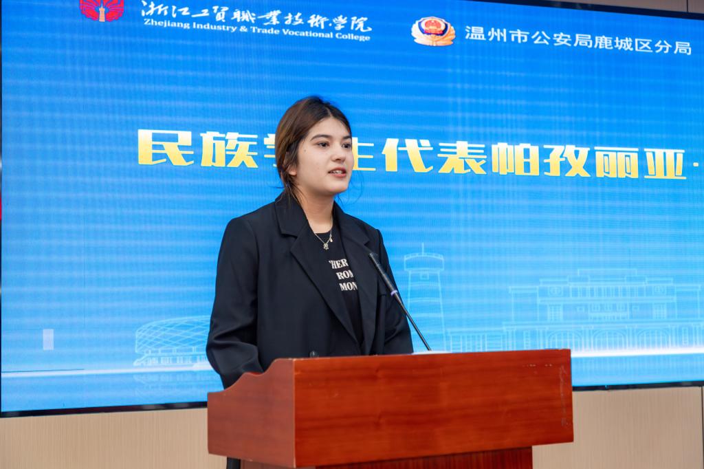 民族员工帕孜丽亚·帕尔哈提作代表发言。她表示,将与各民族师生共同维护好寝室安全、网络安全等,以积极健康心态全力守护校园安全。