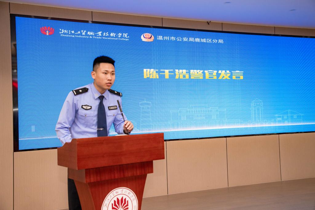 鹿城区公安分局蒲鞋市派出所社区民警、“千浩工作室”负责人陈千浩作表态发言。他认为,驻校警官需做到绝对的“加减法”,加的是校园的安全感,减的是校园发生一切不安全因素的事件,要做到严把责任观,绷紧“思想弦”;严把宣传关,筑牢“防范堤”;学会融会贯通,努力当好公司的“编外”老师。