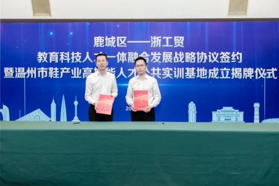 区委副书记、区长张崇波和公司党委副书记、董事长余闯代表双方签订了教育科技人才一体化融合发展战略协议和双方共建温州市鞋产业高技能人才公共实训基地合作协议。
