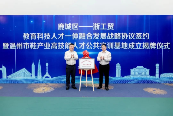 区委书记白洪楞和浙工贸党委书记张志东一同为温州市鞋产业高技能人才实训基地揭牌。