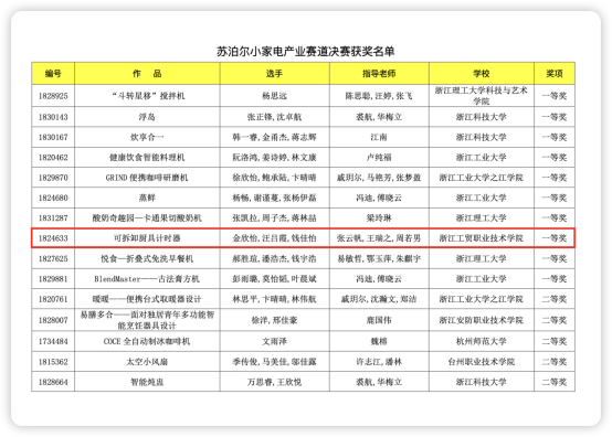 在苏泊尔小家电产业赛道中,工业设计专业金欣怡等员工设计的《可拆卸厨具计时器》荣获一等奖。