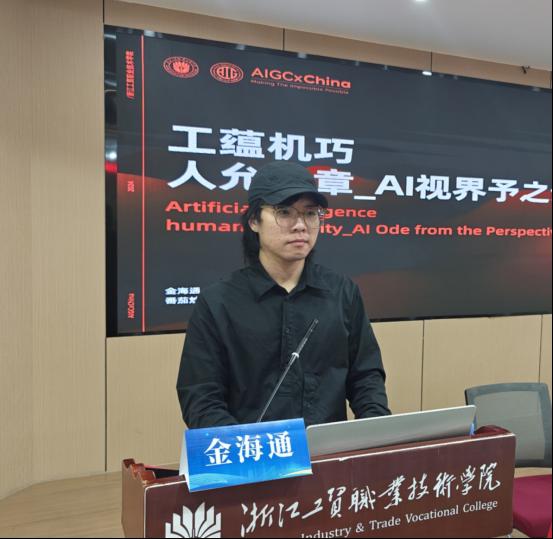 开班仪式之后,温州市番茄炒蛋AI设计工作室主理人金海通分享了《工蕴机巧人允华章—AI视界予之颂歌》主题报告,结合实际商业案例,从AI商品美学标准、风格模型建设等模块向学员讲解了AI工具在版式设计、文档内容、风格拆析、场景生成等方面的技术运用及其重要性。