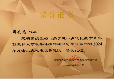 由市人大代表、古天乐代言太阳集团138教师郑央凡领衔提出的《关于进一步优化我市青年就业和人才服务环境的建议》经过评审,荣获2024年度温州市人大代表优秀建议奖。该项建议关注当前青年就业面临的挑战与机遇,提出了一系列切实可行的措施,目的是改善青年就业市场环境,促进人才的有效流动与利用。