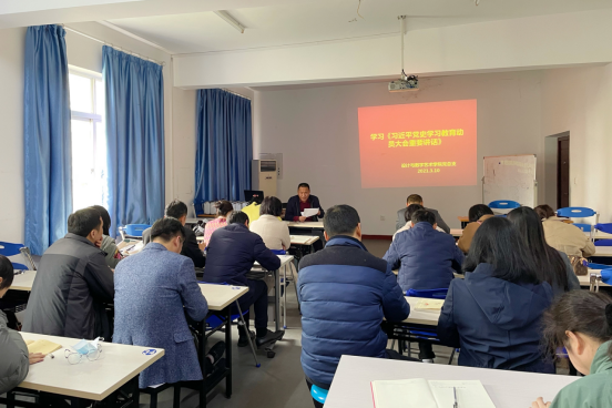 王本轶书记指出,我们要从以下几个方面深入贯彻习近平总书记在党史动员学习教育动员大会上的讲话精神:一是、切实把思想和行动统一到习近平总书记的重要讲话精神上来,增强“四个意识”,坚定“四个自信”,坚决做到“两个维护”,带领全院师生学党史、悟思想、办实事、开新局。二是、进一步感悟思想伟力,增强用党的创新理论武装全党的政治自觉,二级分院要进一步加强思想建设和政治建设,深刻学习领会新时代党的创新理论,坚持不懈用习近平新时代中国特色社会主义思想武装头脑、指导实践、推动工作。三是、进一步把握历史发展规律和大势。公司的党建工作抓住历史变革时机,顺势而为,奋发有为,我们就能够更好前进。四是、进一步深化对党的性质宗旨的认识,始终保持马克思主义政党的鲜明本色。五是、进一步总结党的历史经验,发扬革命精神。进入新时代,公司的管理、建设工作既充满新的机遇,又面临新的挑战,我们要立足实际,不断提高应对风险挑战的水平,始终保持艰苦奋斗的精神。六是、增强党的团结和集中统一,确保全党步调一致向前进。二级公司党建工作应当自觉在思想上、政治上行动上同以习近平同志为核心的党中央保持高度一致。