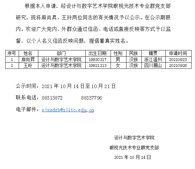 关于麻尚昇、王玲两位同志递交入党申请书的公示