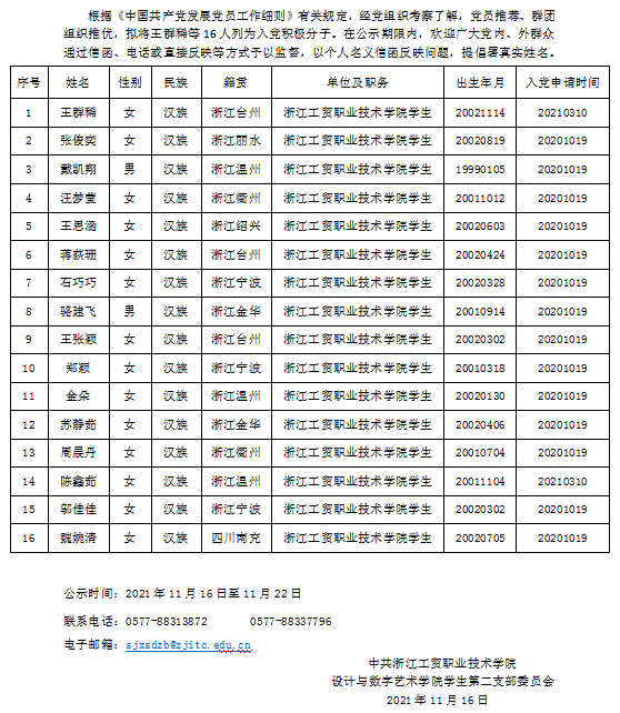 拟将王群稀等16人列为入党积极分子的公示