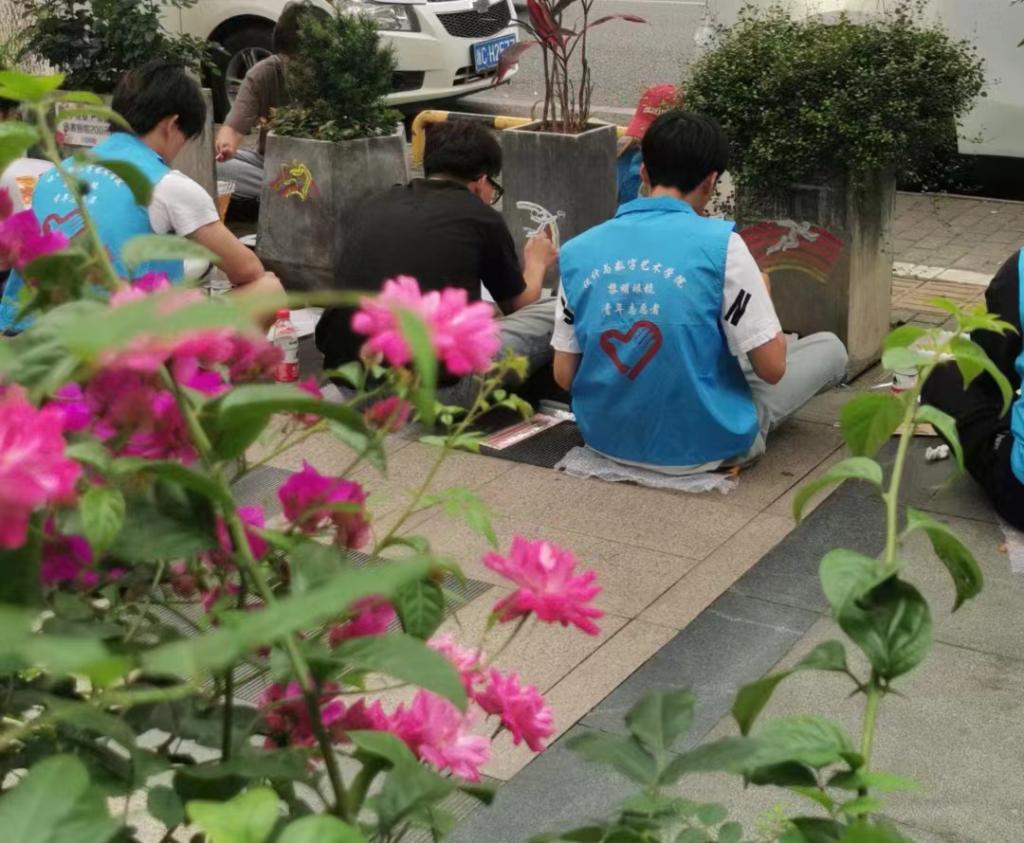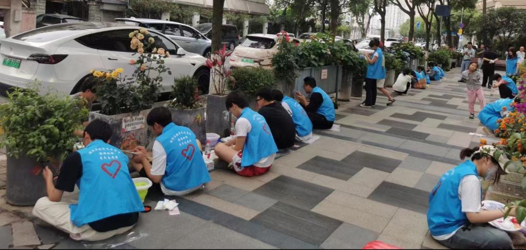 活动当天,同学们不畏高温烈日,无惧蚊虫叮咬,历时一天半时间完成30个大小花盆的彩绘,受到社区的高度赞扬。