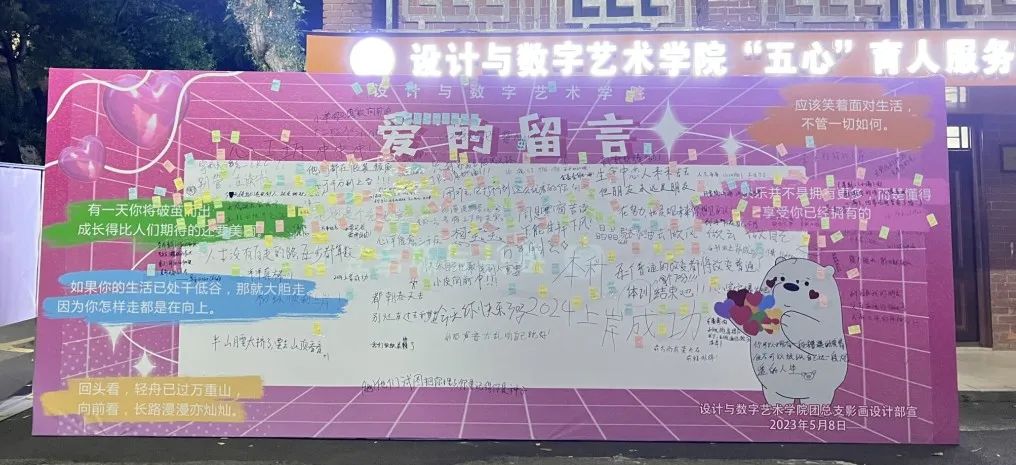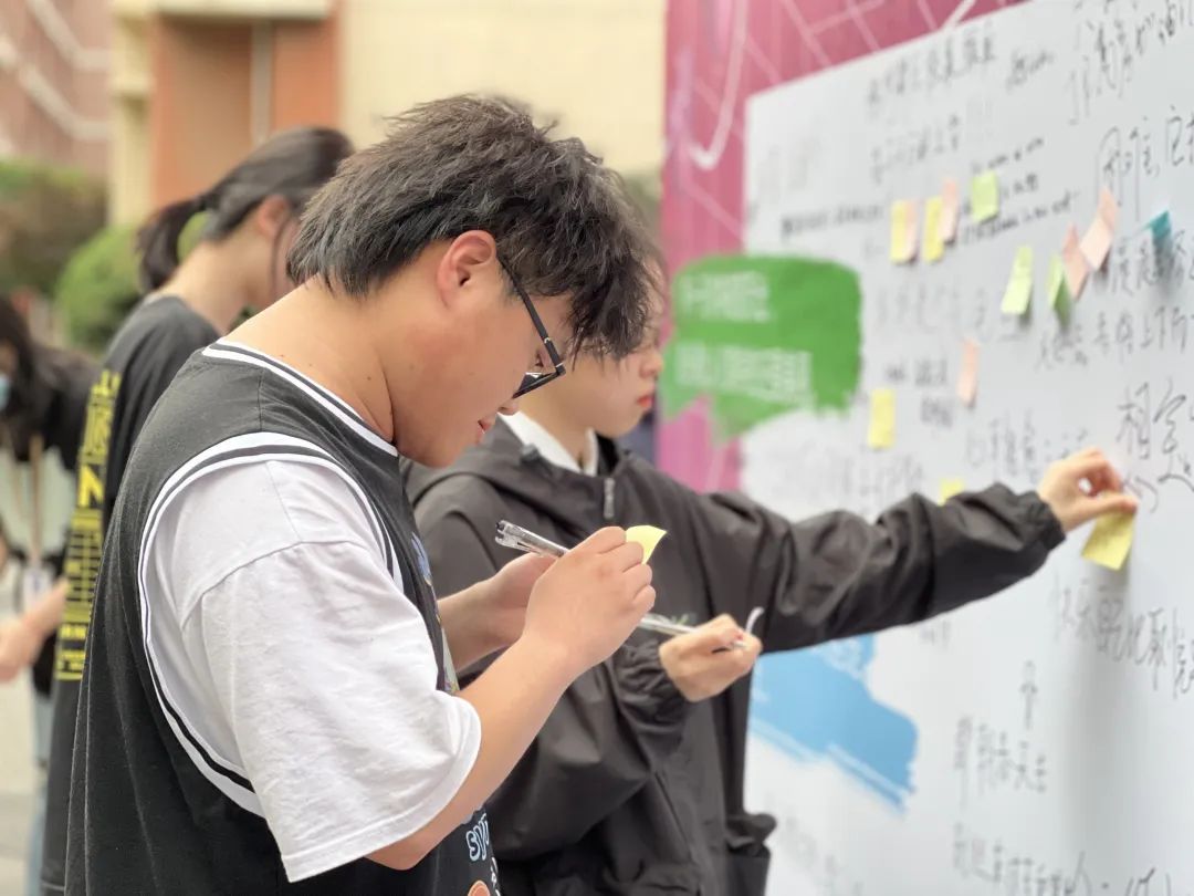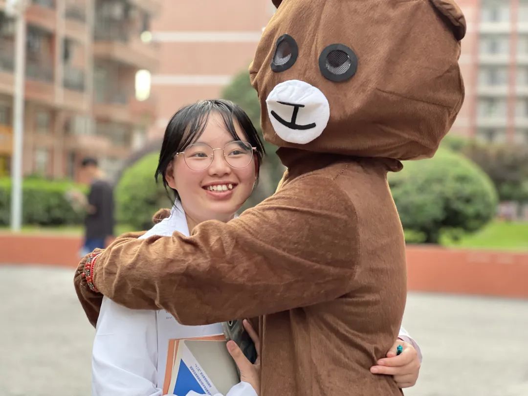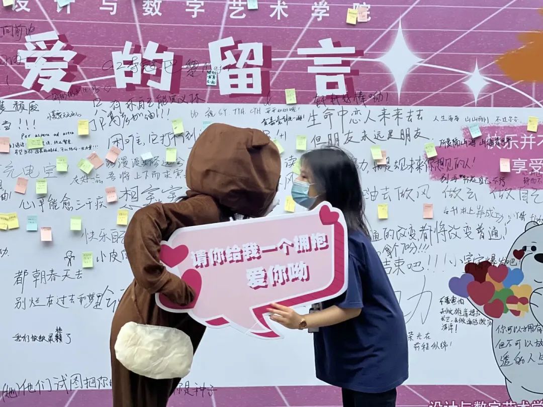 活动过程中,辅导站为同学们提供便利贴,让同学们把自己的情绪分享在爱的留言墙上。留言中有发泄自己心中的苦闷,有对身边好友的祝福,也有对自己的鼓励。活动现场,可爱熊还会主动“求抱抱”,同学们被小熊的蠢萌调皮的样子逗乐,主动“投怀送抱”。在拥抱结束后,小熊也会送上祝福的话或者是给同学比心,让同学们切实感受到了惊喜和温暖。