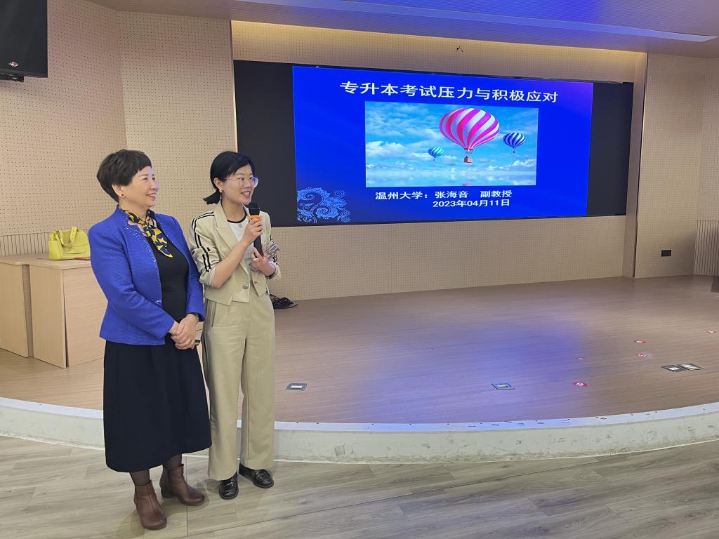 为帮助公司员工掌握心理健康知识和技能,增强尤其专升本员工考试前后的心理健康素质,公司邀请特邀浙江省高校心理援助专家、幸福力导师、温州大学首席心理咨询师张海音副教授,为公司员工进行“专升本考试压力与积极应对”的讲座。