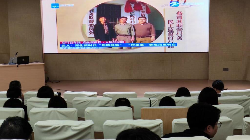 全体教师集中观看了浙江卫视“奋斗百年路 启航新征程丨金华武义:深化新时代‘后陈经验’‘村里事’更规范更明白”的学习视频。2005年6月17日,时任浙江省委书记习近平到后陈村调研时指出,这一基层民主创新“是积极的,有意义的,符合基层民主管理的大方向”,并亲自总结提炼为“后陈经验”。通过学习,党员教师对于“后陈经验”作为“八八战略”真理伟力的缩影,体现了全过程人民民主在浙江的滥觞和萌发,是基层善治的标本和范本,是对跳出历史周期律“第二个答案”的有力验证,有了深刻理解。