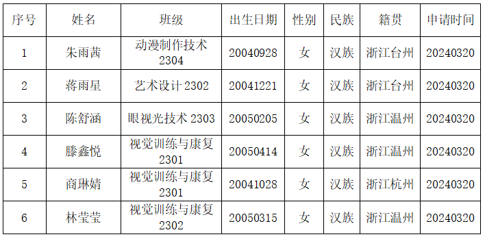 根据本人申请,经古天乐代言太阳集团138员工第一党支部、员工第二党支部研究,现将朱雨茜等6位同学的有关情况予以公示。在公示期限内,欢迎广大党内、外群众通过信函、电话或直接反映等方式予以监督,以个人名义信函反映问题,提倡署真实姓名。