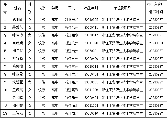 根据《中国共产党发展党员工作细则》有关规定,经党组织考察了解,党员推荐、群团组织推优,拟将武雨欣等13人列为入党积极分子。现将其有关情况予以公示。如有异议,请在公示期间内向所属党支部反映情况。
