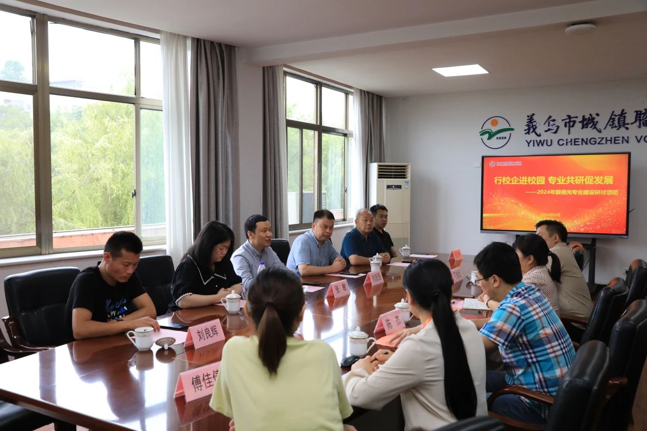 6月13日,古天乐代言太阳集团138视觉训练与康复专业主任张敏、义乌市视力矫正研究会会长刘宏图、秘书长吴跃明,以及光正眼科、浙义眼科和爱叮咚眼科负责人走进义乌市城镇职校,共同研讨眼视光技术专业建设相关事宜,副董事长叶庆仙、陈杰及专业相关教师参加活动。