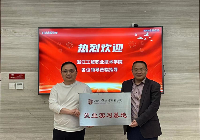 2023年4月26日下午。为了解眼视光用人单位需求,调研毕业生发展现状,深度开展产教融合教学。设计与数字艺术公司王本轶经理、眼视光专业主任易际磐、人才招聘辅导员周元雄一行走访了浙江毛源昌眼镜有限公司,并与公司举行了“实习就业基地”授牌仪式。