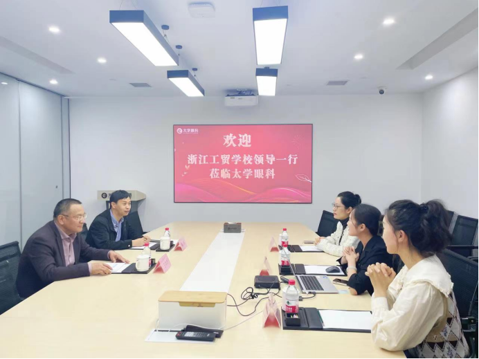 王经理就公司及专业基本情况作相关介绍,表示眼视光技术专业是公司特色专业之一,办学历史悠久,自2000年创办至今已有20余年。公司的眼视光技术专业紧贴温州经济支柱行业,得到了行业和政府的大力支持,未来希望能与更多像太学这样的优质企业建立合作,深入教学领域,通过资源共享实现合作共赢。王经理还提出公司员工多来自浙江省内,而太学眼科业务目前分布江浙沪一带,员工就业地域意向较为匹配,期待通过这一契机,和太学逐步建立合作,共同探索产学研深度融合的校企合作之路。