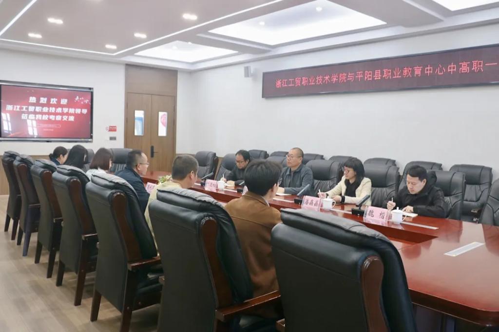 随后,陈明亮董事长汇报了平阳职教中心在党建、项目创建、能力大赛等方面取得的点滴成绩。他指出,平阳职教中心努力实现专业有特长、就业有优势、创业有基础、升学有希望、发展有空间五大育人目标,希望双方深入合作,一起研磨中高职一体化人才培养方案,共同培育符合温州经济发展需要的高素质劳动者和技能型人才。