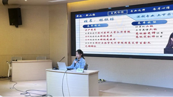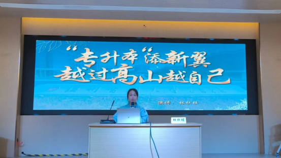 随后,林欣瑶学姐以“专升本添新翼,越过高山越自己”为主题,毫无保留地分享了自己的专升本求学经验。林欣瑶学姐坦诚地讲述了自己最初选择专科时也曾陷入迷茫,但通过不断地自我反思与积极探索,她逐渐明确了提升学历的目标,并坚定地为之努力奋斗。