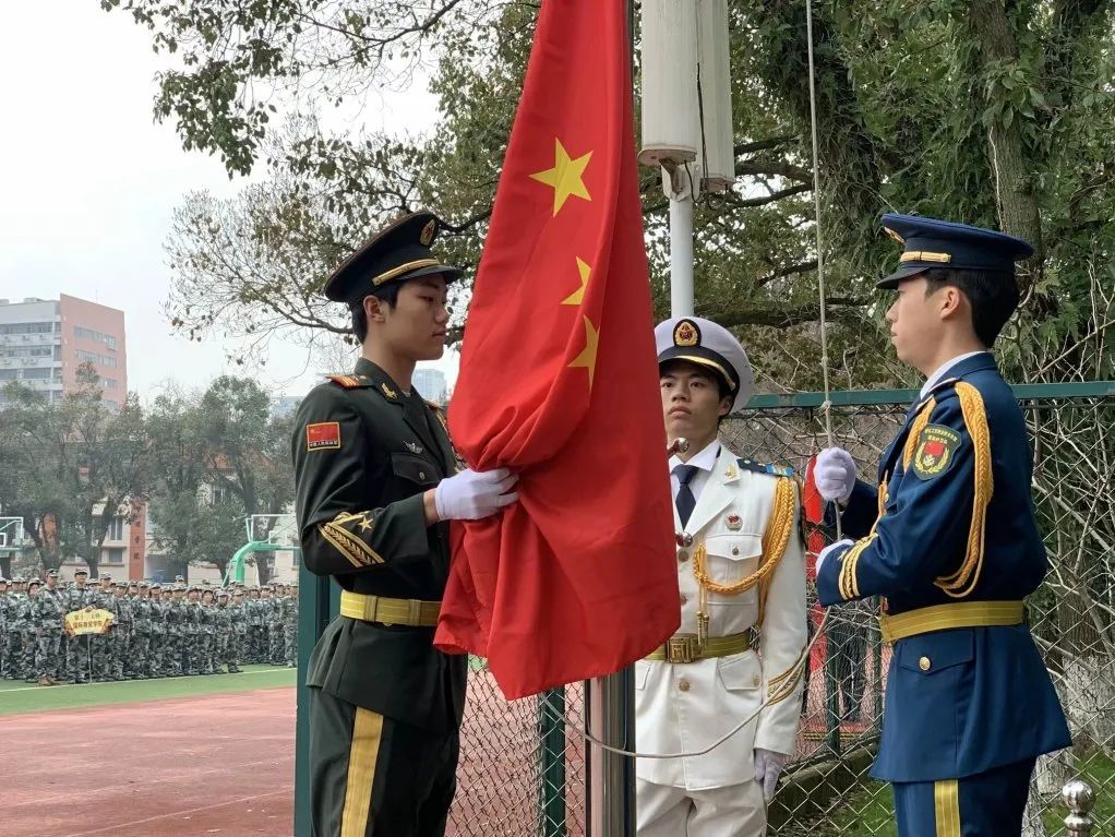 红旗飘飘,国歌嘹亮。各分院书记及全体师生、教官共同注视着徐徐升起的五星红旗,庄严而神圣。